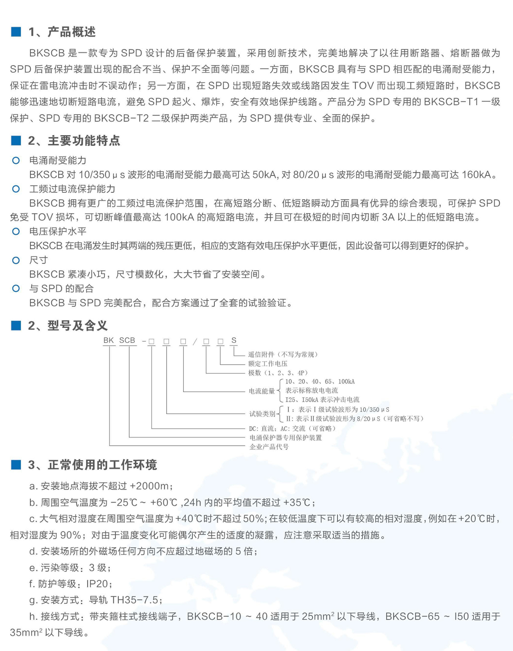 BKSCB系列電涌掩護器公用掩護裝配合用于交換50Hz/60Hz、額外任務電壓至400V,需裝配SPD(防雷掩護器)裝備的電路中,為實驗種別為Ⅰ類和II類的電涌掩護器供給專業的后備掩護。本產物合適NB/T 42150規范。