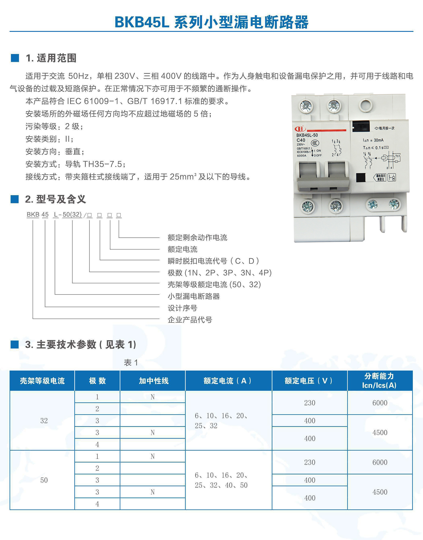BKB45L-50系列帶殘剩電流掩護小型斷路器合用于交換50Hz、額外電壓至400V,額外電流6~50A 的線路中。作為人身觸電和裝備泄電掩護之用,并可用于線路和電氣裝備的過載和短路掩護。在一般環境下亦可用于不頻仍的通斷操縱。本產物合適GB/T 16917.1、IEC 61009-1規范。