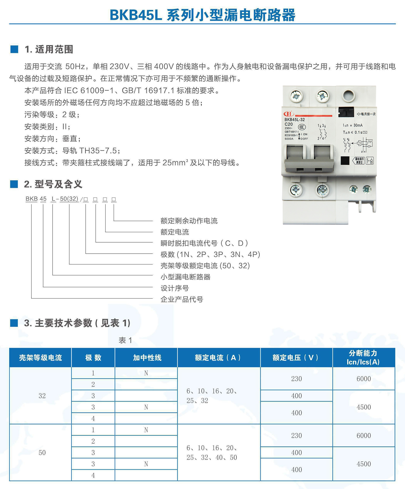 BKB45L-32系列帶殘剩電流掩護小型斷路器合用于交換50Hz、額外電壓至400V,額外電流6~32A 的線路中。作為人身觸電和裝備泄電掩護之用,并可用于線路和電氣裝備的過載和短路掩護。在一般環境下亦可用于不頻仍的通斷操縱。本產物合適GB/T 16917.1、IEC 61009-1規范。