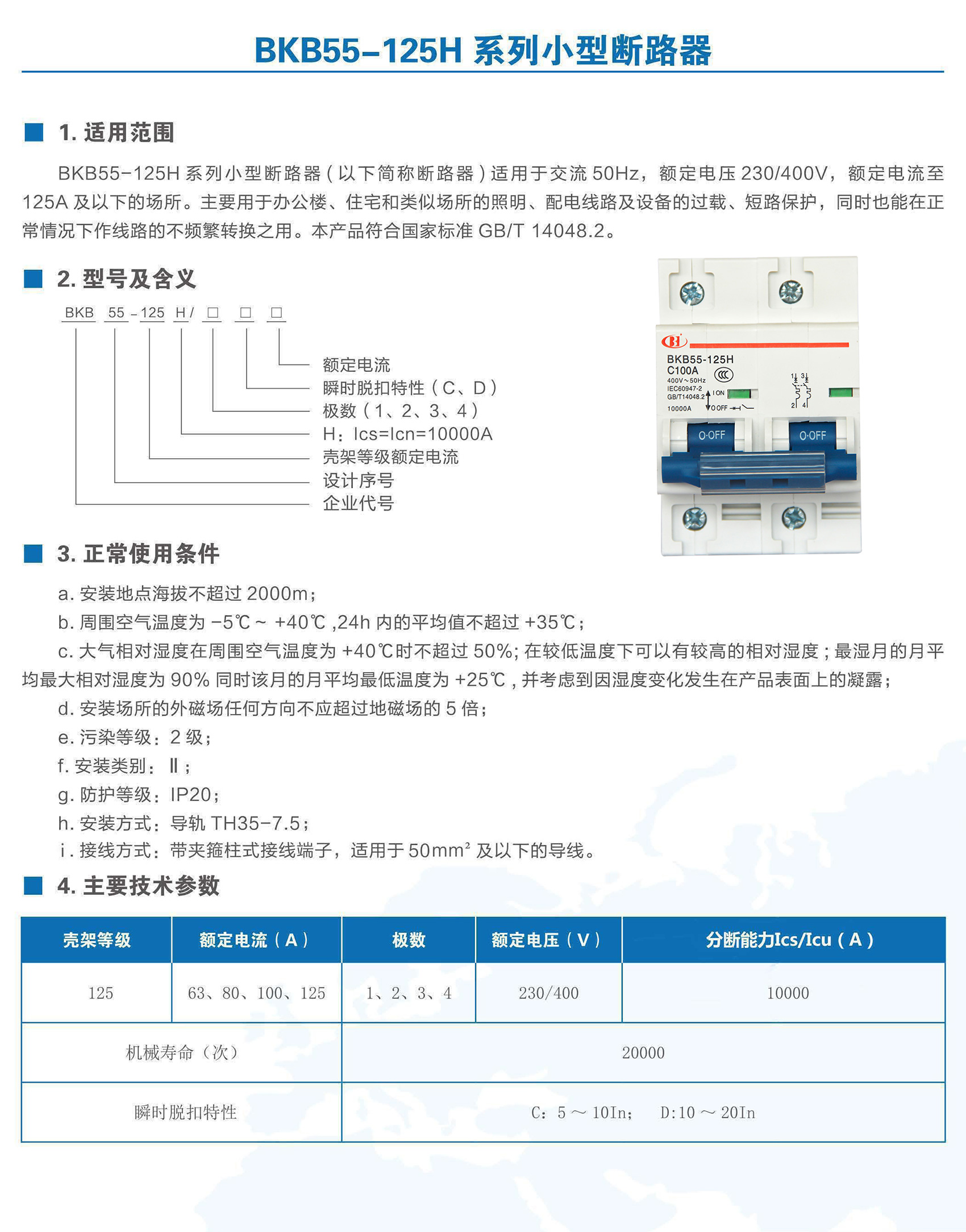 BKB55-125H系列小型斷路器合用于交換50Hz,額外電壓至400V,額外電流63~125A的體系線路中。用來對修建電廠、變電站、電信、交通、冶金、工礦業等及近似場合的體系線路、電氣裝備停止過電流掩護,也能夠用于不頻仍的通斷操縱。合用于非專業職員利用且不須要停止掩護。本產物合適GB/T 14048.2、IEC 60947-2規范。